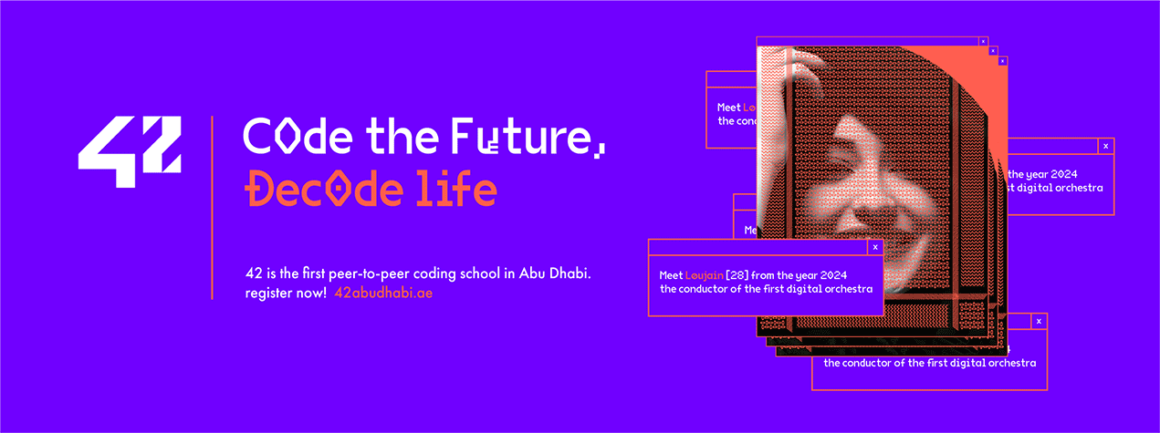 42 Abu Dhabi, a revolutionary peer to peer coding school founded in France in 2013 and expanding towards the UAE scene. With the mission to transform culture, disrupt eduction and create opportunities by making code accessible to everyone.