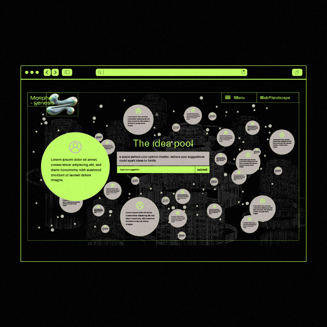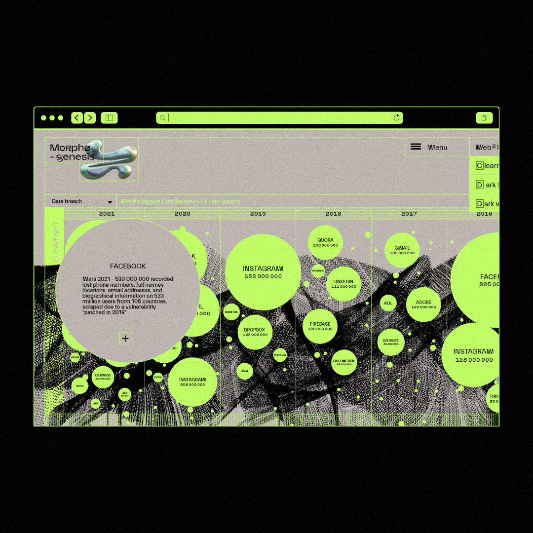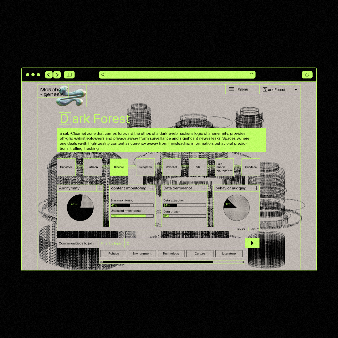 The interactive website contributes to informing and updating the ongoing shift in the media sphere: The user will be able to witness the growth and the safety of the Dark Forest by getting visual insights on data breaches, behaviour nudging, shadow banning and biased content moderation that takes place on the Clearnet in comparison with the Dark Forest. It features a digital tool kit on how to surf around the online landscape and enables users to shape the growth of the Dark Forest through a communication idea pool vehicle that increases the flow of user-generated content to potentially fortify and expand the Dark Forest its own independent universe. No data collection or surveillance will be required from the visitor: privacy and anonymity are given on Morphogenesis-z.