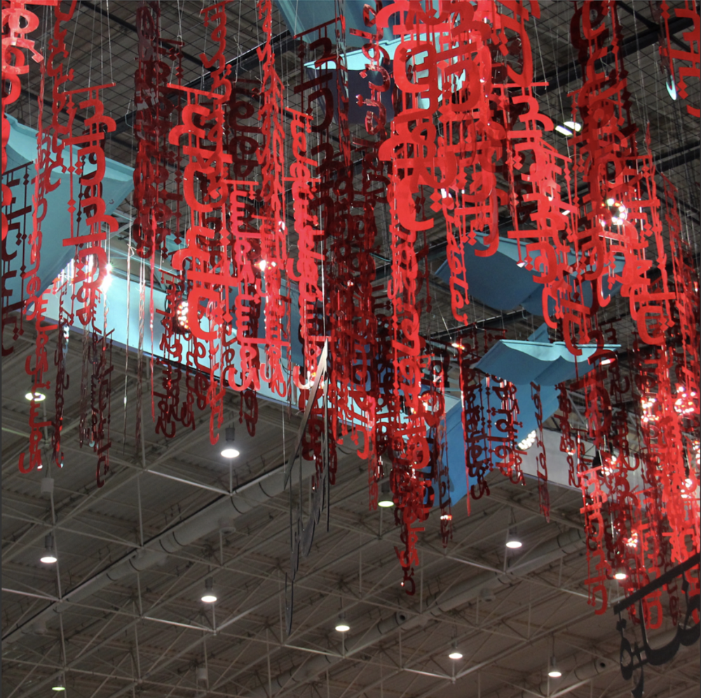 the stand celebrated a cultural heritage through typographic installations highlighting the power of words and the beauty of traditional and modern typography simultaneously with the addition of oversized books that completed the hanging typographic installations.