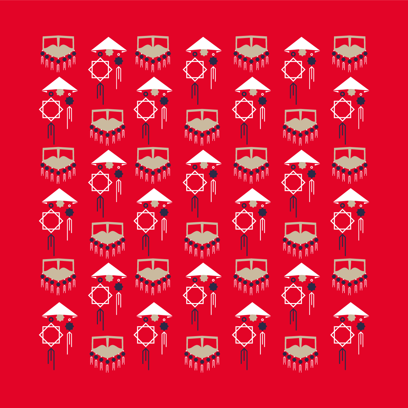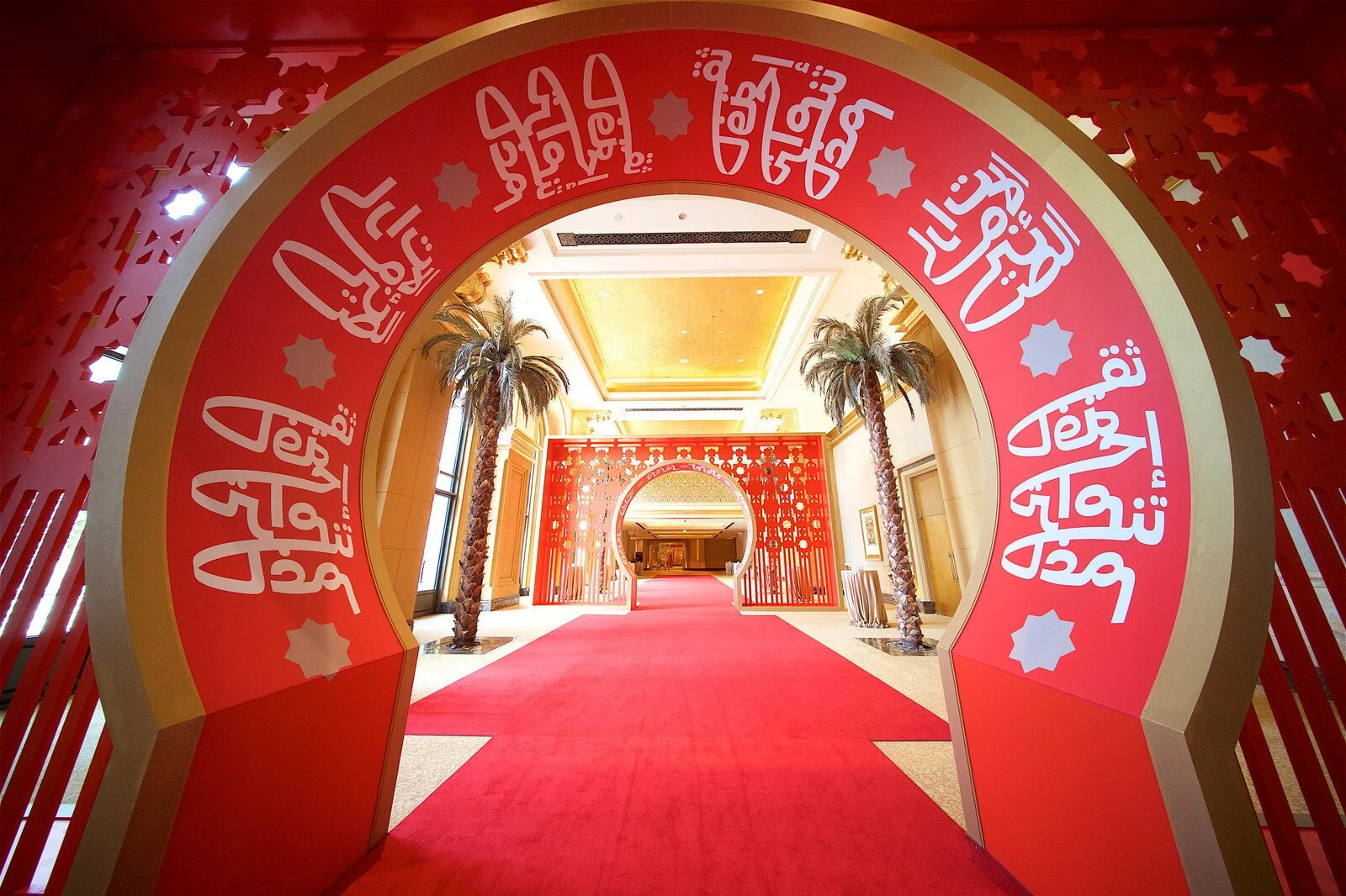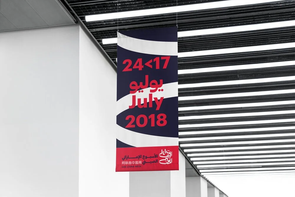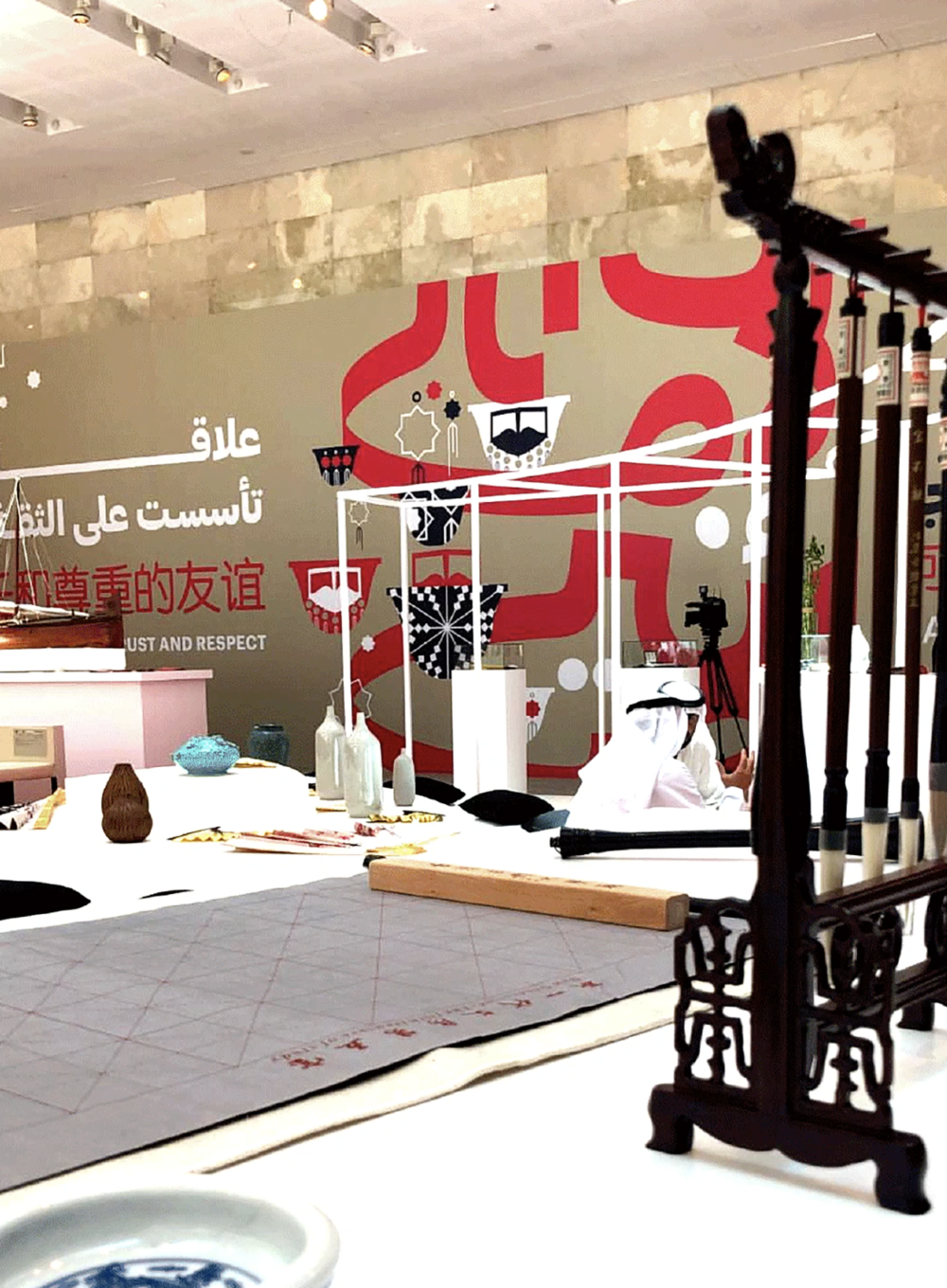 the Arabic coffee cups with typography symbolise a welcoming cultural harmony. In contrast, the burqa and flying lanterns convey a cultural tradition in a fresh reimagined context, an experience rooted in traditions but looking into the future.